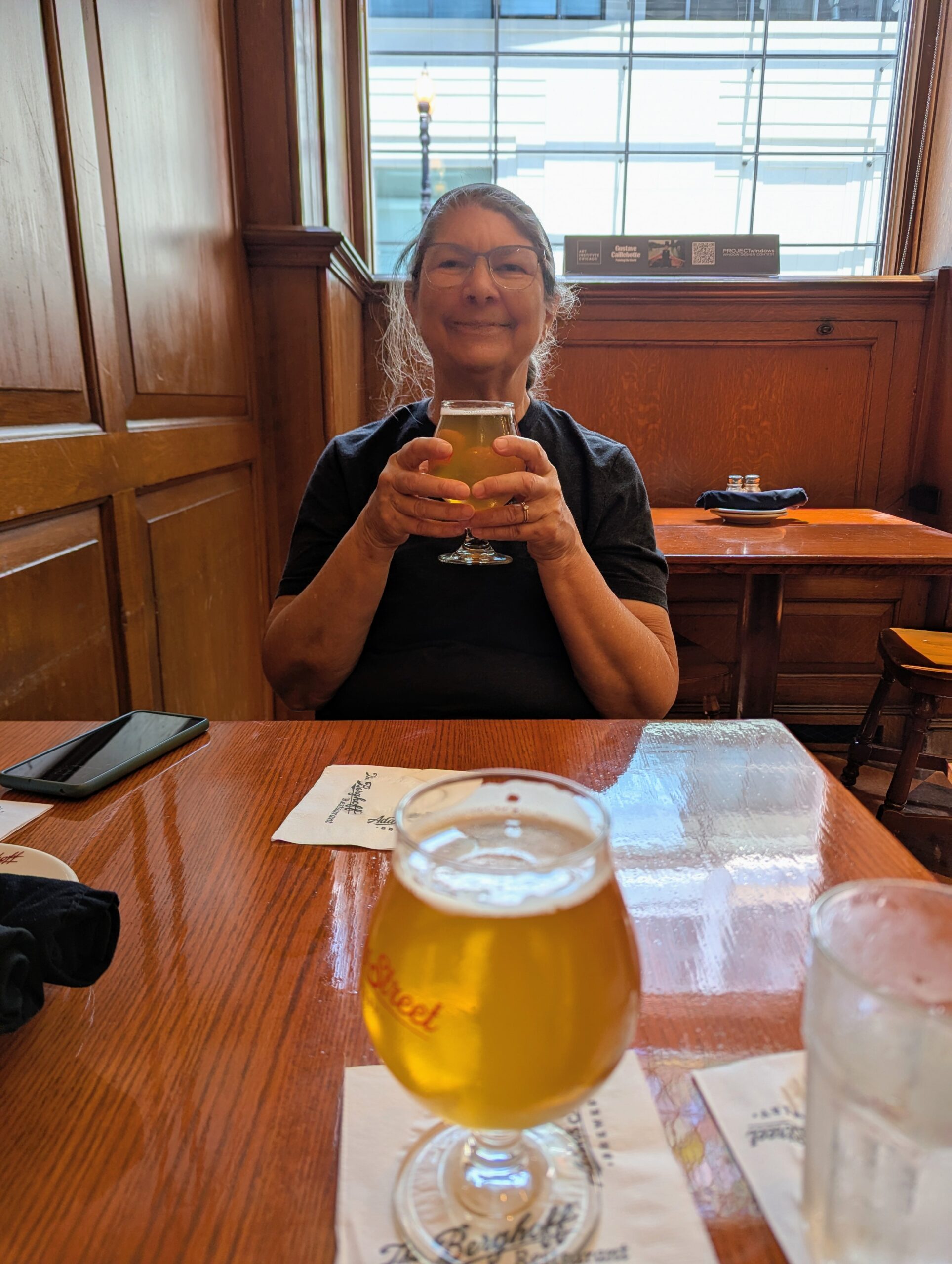 Every time before, when we were ready for lunch after visiting the Art Institute, the Berghoff had a line, but this time not, so here we are. Both of us are drinking their session ale, called Globetrotter. Good. Refreshing. Jackie likes it better than All Day IPA.