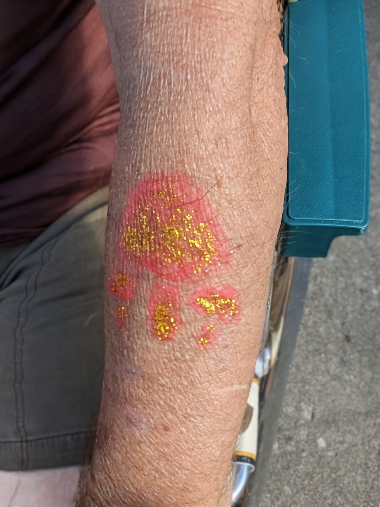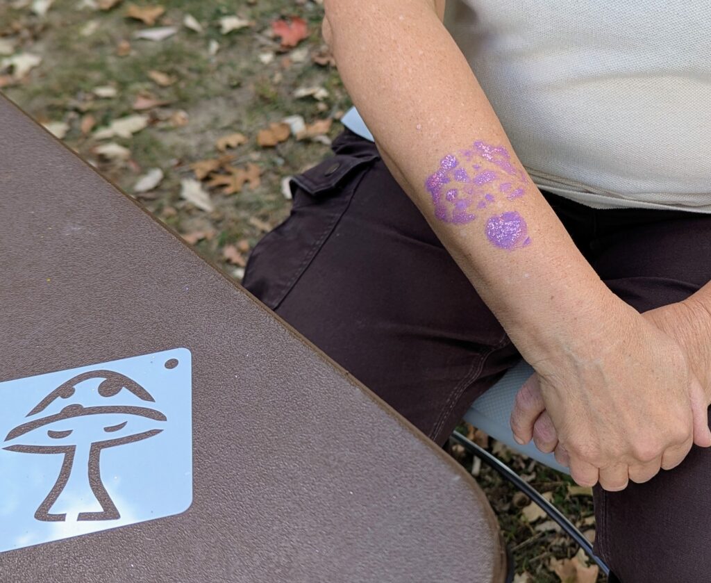 Among the many other activities, there was a woman using stencils to paint mushrooms on people’s arms. Jackie and I each got one done. With sparkles!