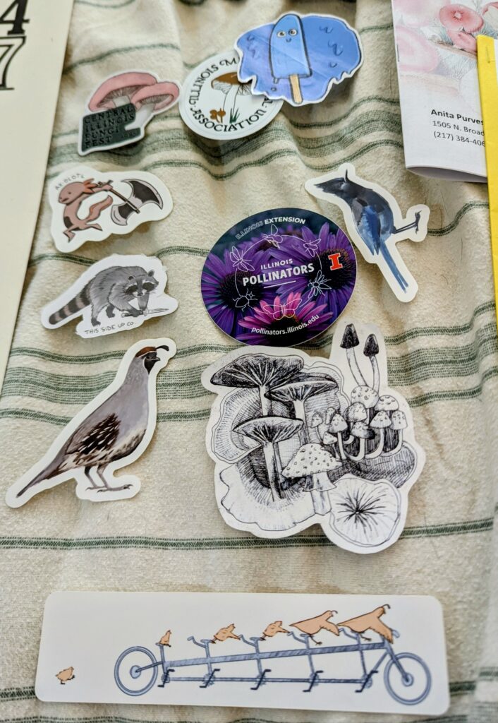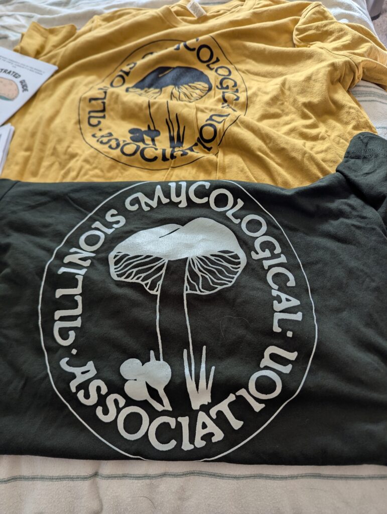 We had great fun at the fungus-fest as well! We got the stickers (see above). We also each bought an Illinois Mycological Association t-shirt! (Mine is printed with glow-in-the-dark ink, which I’m expecting to enjoy very much, once it gets dark.)