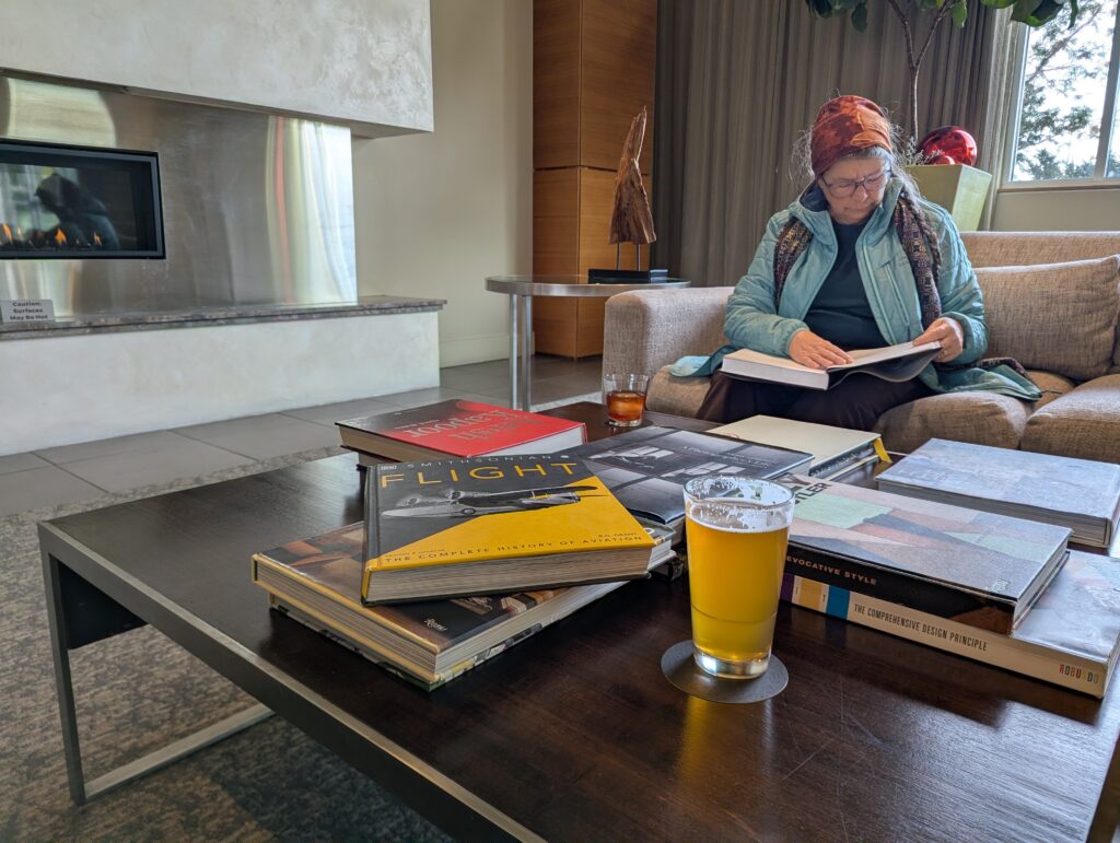 Jackie has an Old Fashioned, while I have a UofIPA, and we’re drinking them in front of the fireplace in the lobby of the iHotel. After we’ll head back to Houlihans for lunch.