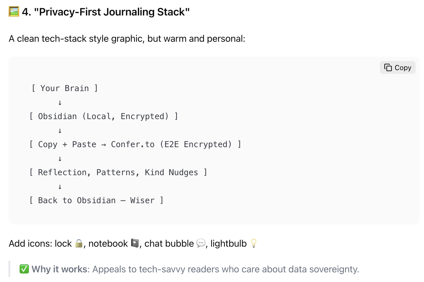 I’ve started using it for journaling exactly as I described. Because of the way the privacy is inherent to Confer, I can’t actually keep my journal within Confer—all the content is lost when I end the session. So, I’m keeping the journal entries in Obsidian, and then copying each entry into Confer when I’m ready to get its take on what I’ve written.